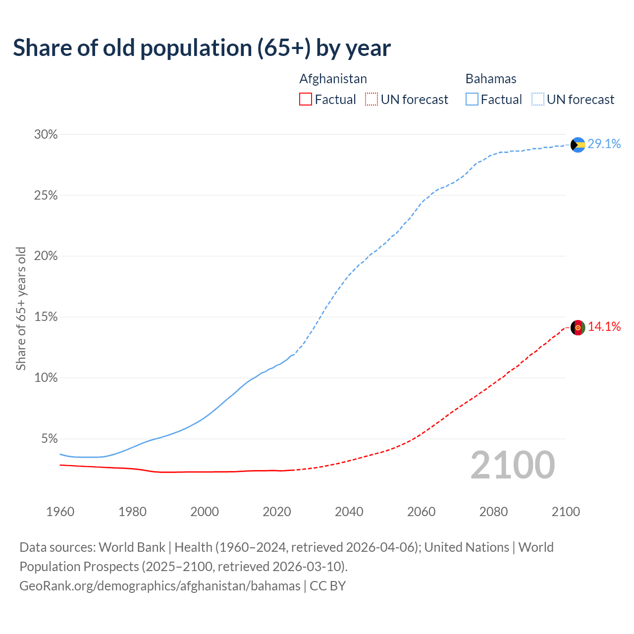 The share of older people aged 65 and over is 2.4% in Afghanistan and 11.8% in the Bahamas. Life expectancy in Afghanistan compared to the Bahamas .