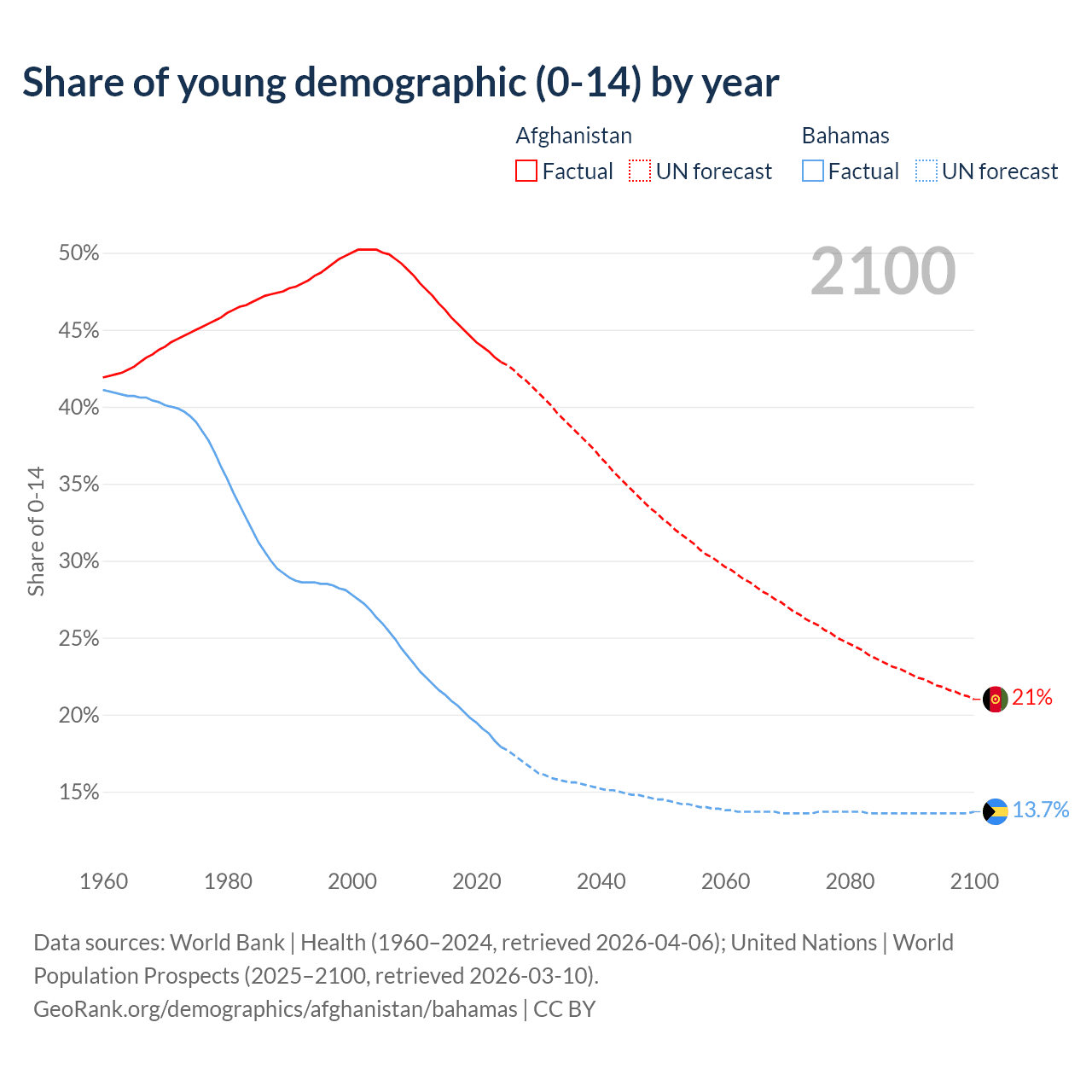 - The share of young demographic (0-15 years old) in Afghanistan is 42.9% vs 17.9% in the Bahamas.