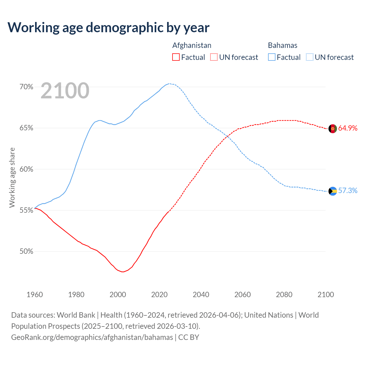 - Afghanistan has 24.8M working age adults (aged 15-64) vs 285K in the Bahamas.