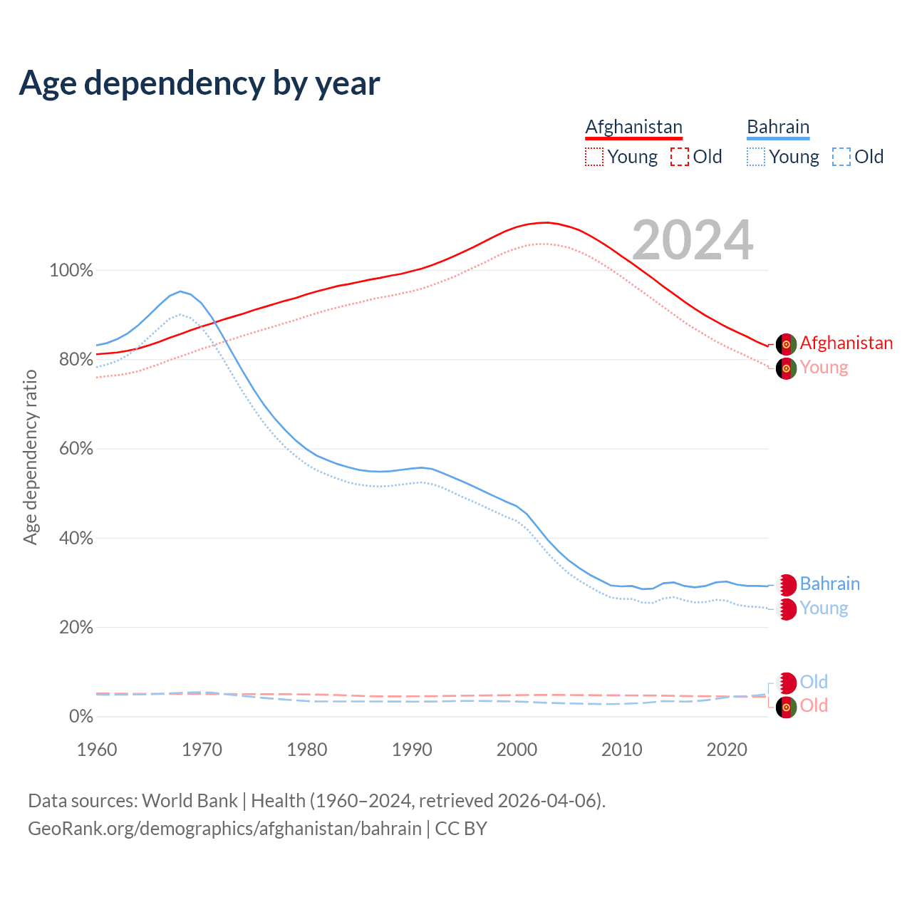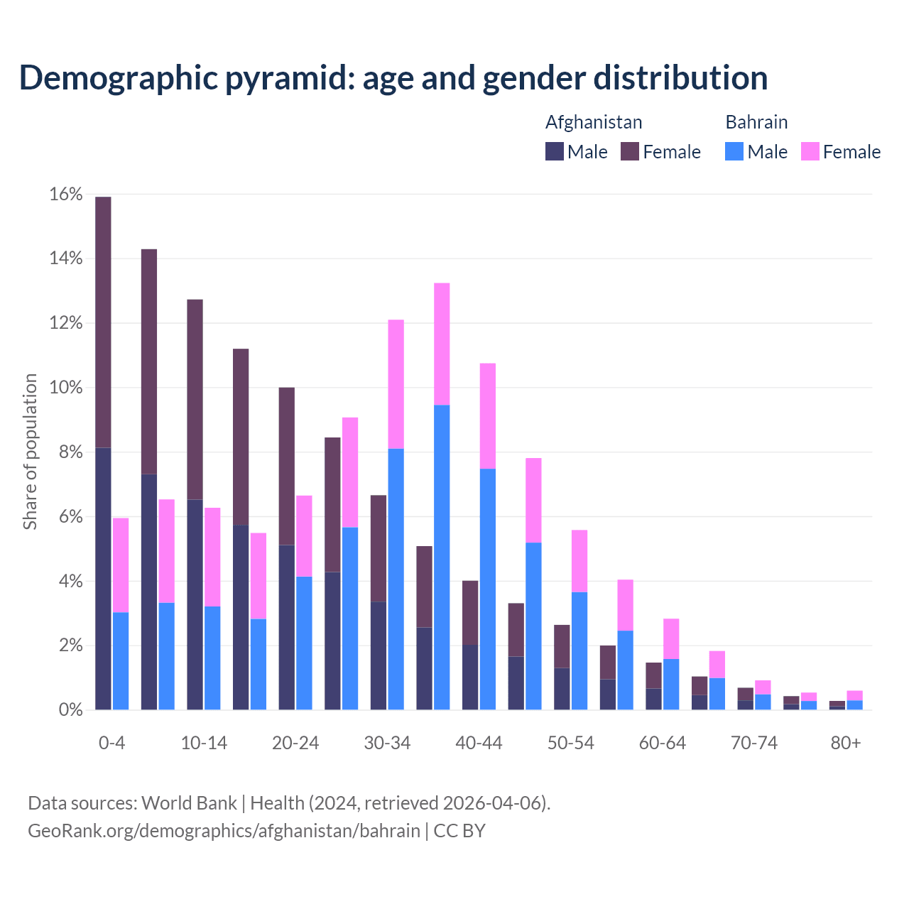 - Afghanistan is ranked 186/196 by median age (oldest to youngest) vs 80/196 for Bahrain.