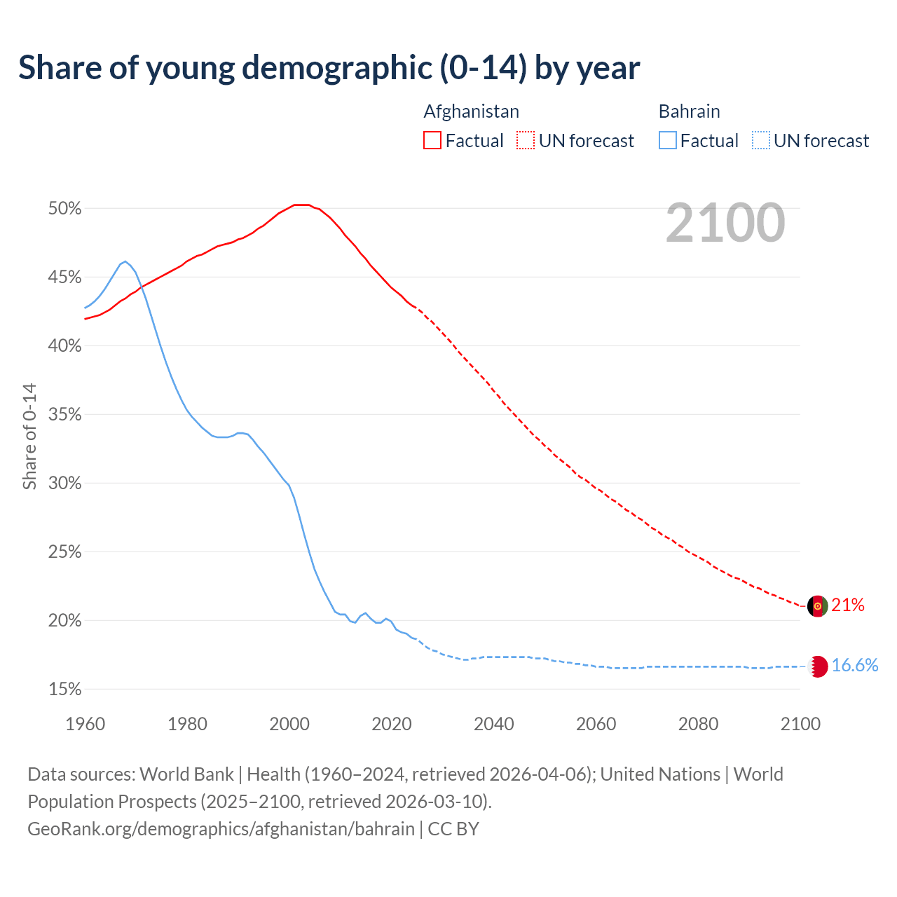 - The share of young demographic (0-15 years old) in Afghanistan is 42.9% vs 18.7% in Bahrain.