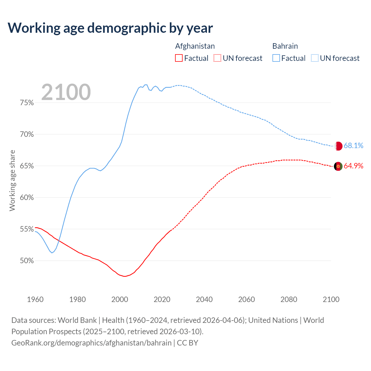 - Afghanistan has 24.8M working age adults (aged 15-64) vs 1.29M in Bahrain.