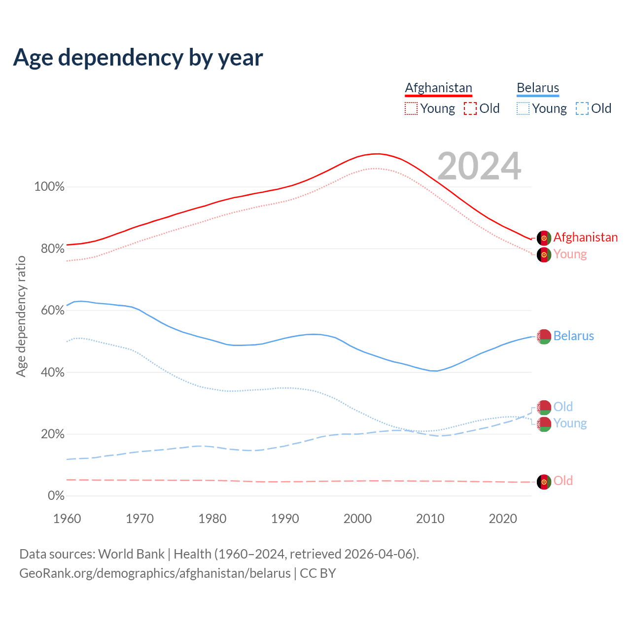 - Afghanistan is ranked 186/196 by median age (oldest to youngest) vs 35/196 for Belarus.