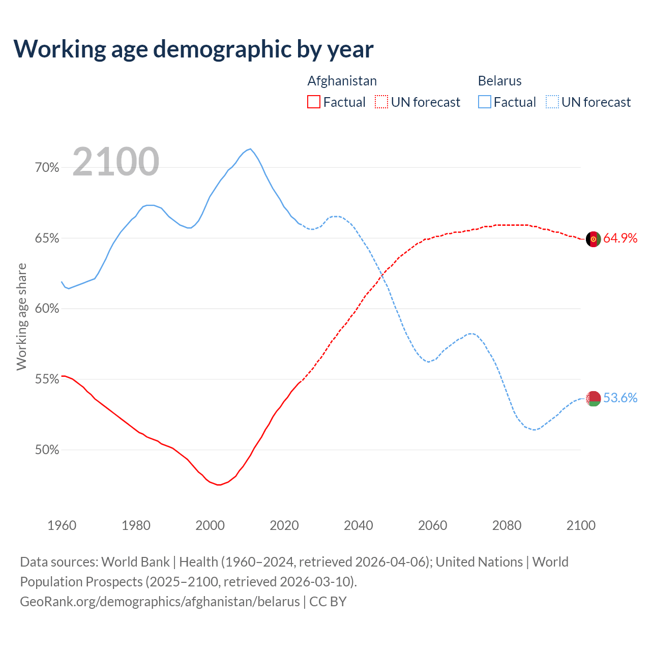 - Afghanistan has 24.8M working age adults (aged 15-64) vs 5.95M in Belarus.
