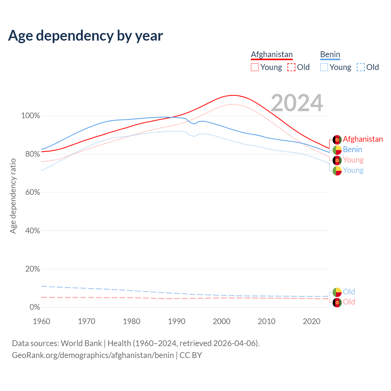 - The share of old-age demographic (65+) in Afghanistan is 2.4% vs 3.12% in Benin.
