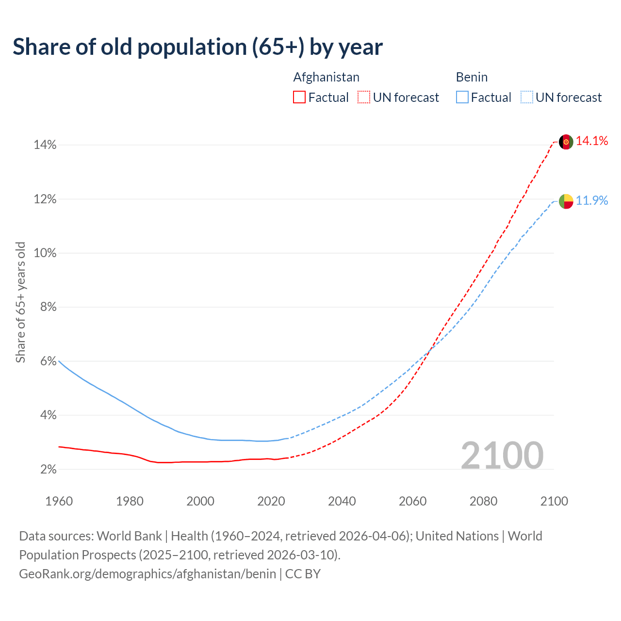 The share of older people aged 65 and over is 2.4% in Afghanistan and 3.12% in Benin. Life expectancy in Afghanistan compared to Benin .