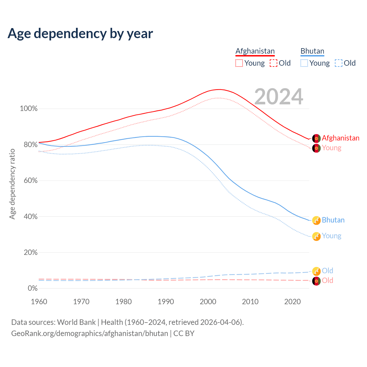 Data sources: World Bank | Health (1960–2024, retrieved 2026-04-06); U.S. Census Bureau (1960–2024, retrieved 2026-02-08).