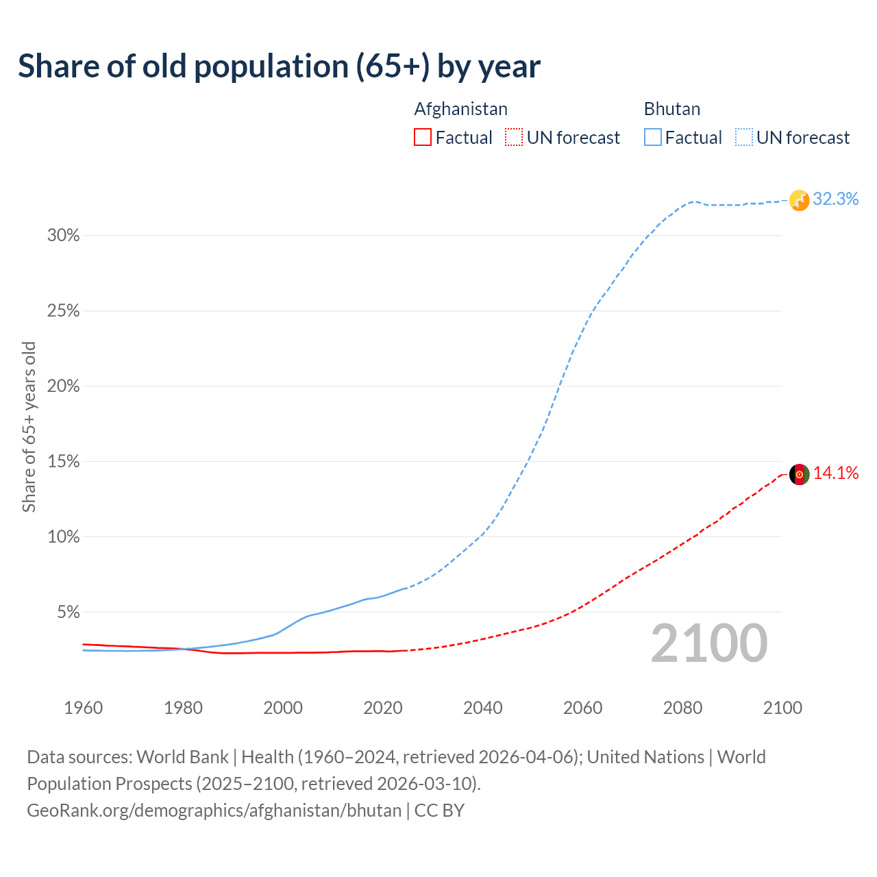 The share of older people aged 65 and over is 2.4% in Afghanistan and 6.49% in Bhutan. Life expectancy in Afghanistan compared to Bhutan .