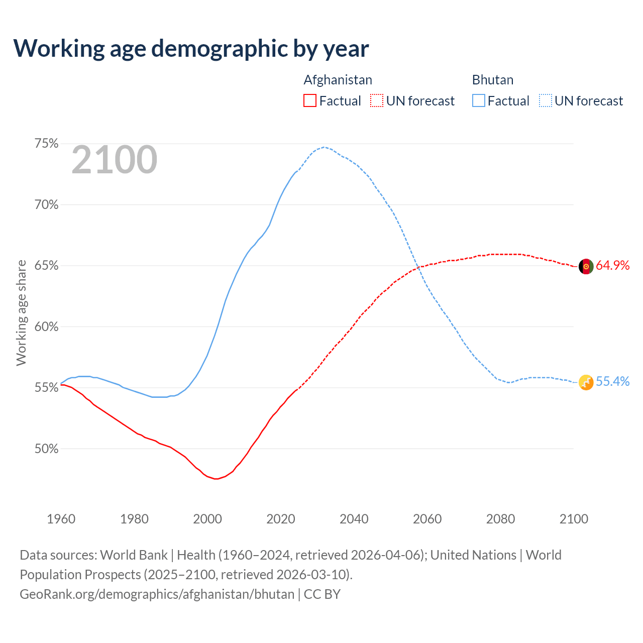 Median age Afghanistan vs Bhutan, 1960-2100