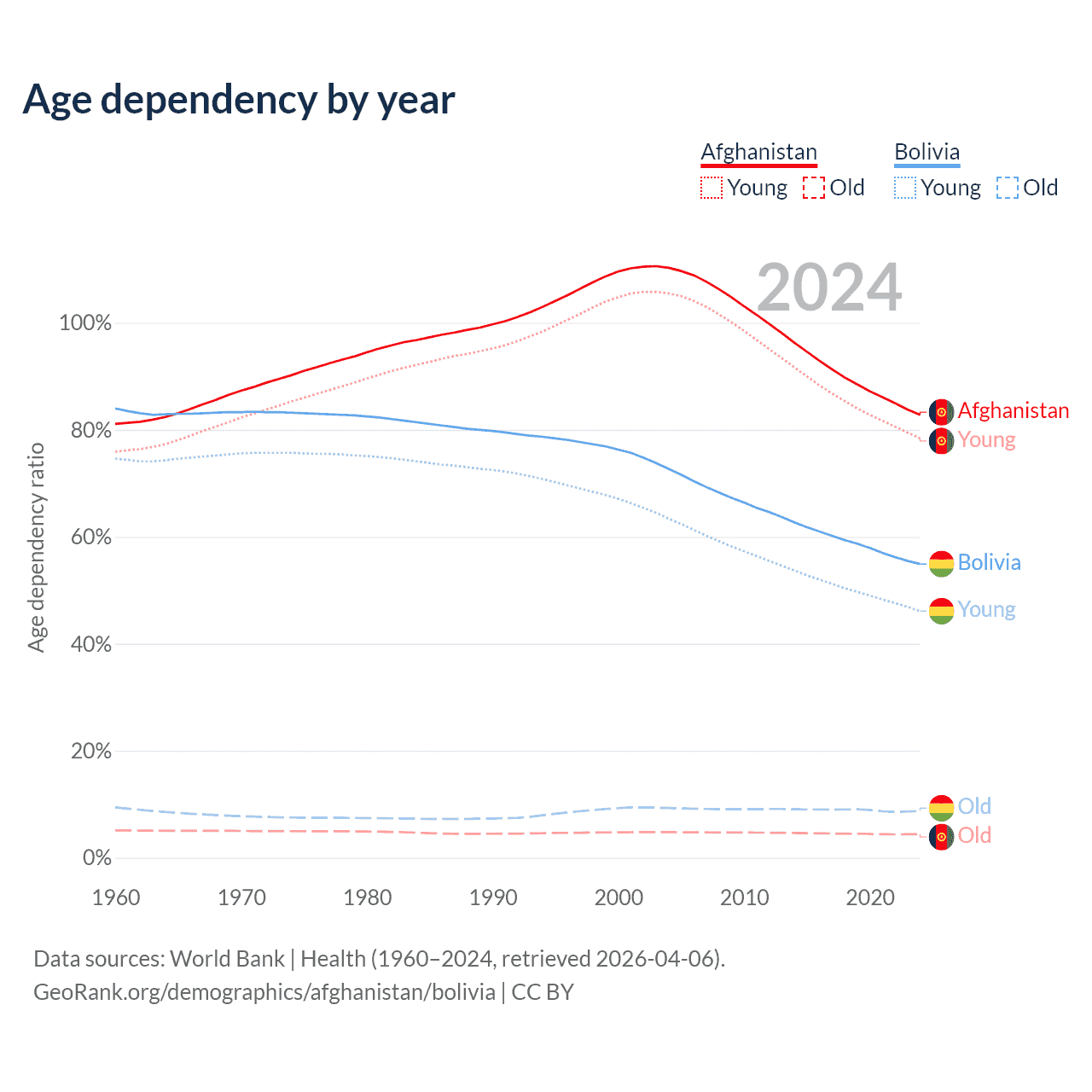 - Afghanistan is ranked 186/196 by median age (oldest to youngest) vs 128/196 for Bolivia.