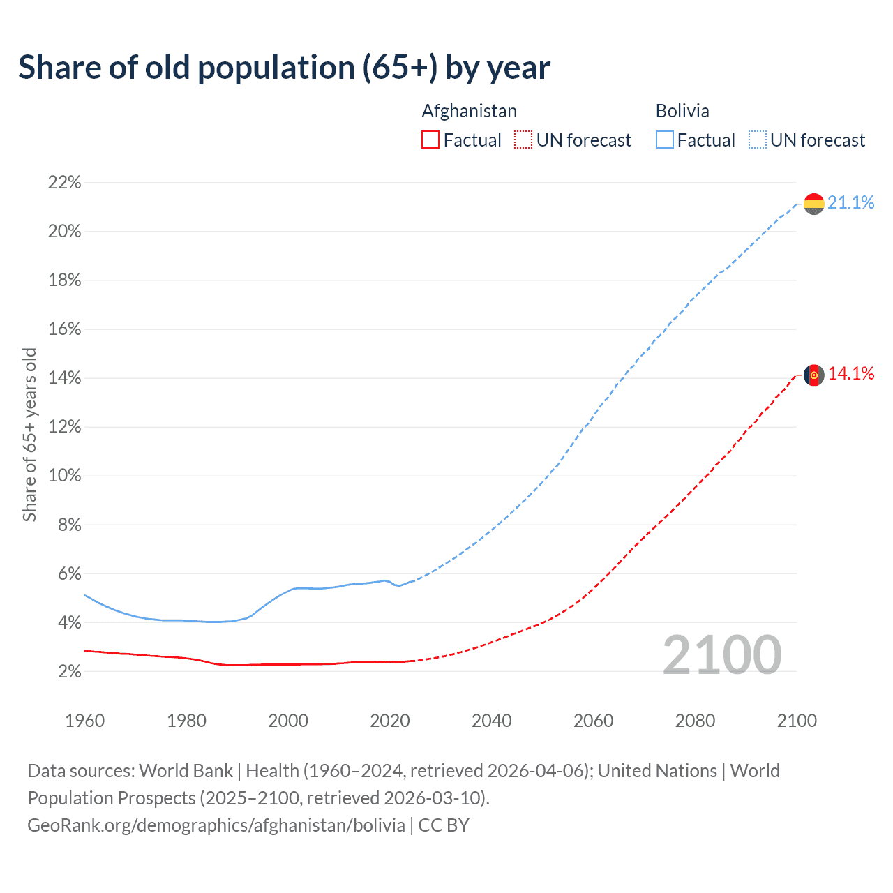 The share of older people aged 65 and over is 2.4% in Afghanistan and 5.64% in Bolivia. Life expectancy in Afghanistan compared to Bolivia .