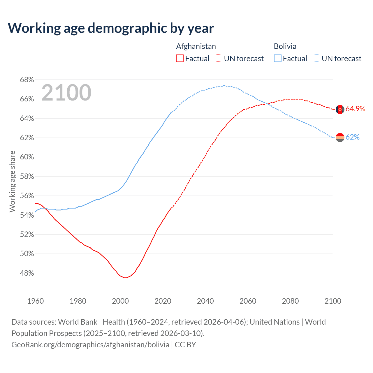 - Afghanistan has 24.8M working age adults (aged 15-64) vs 8.26M in Bolivia.