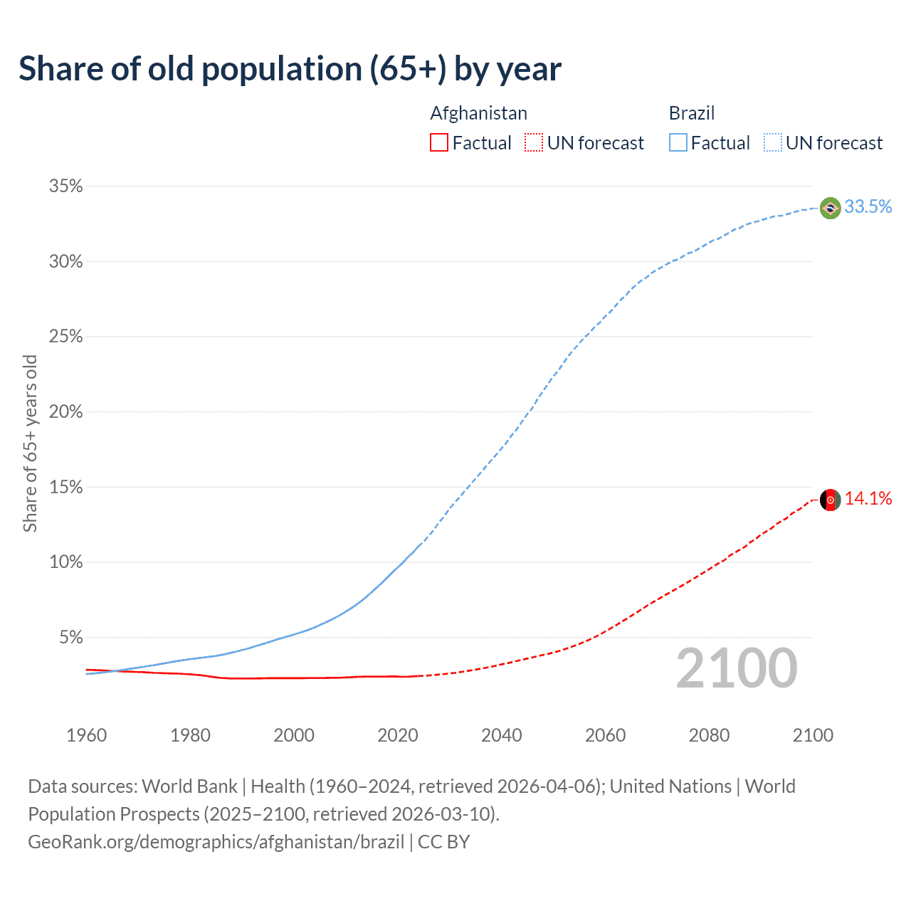The share of older people aged 65 and over is 2.4% in Afghanistan and 11% in Brazil. Life expectancy in Afghanistan compared to Brazil .