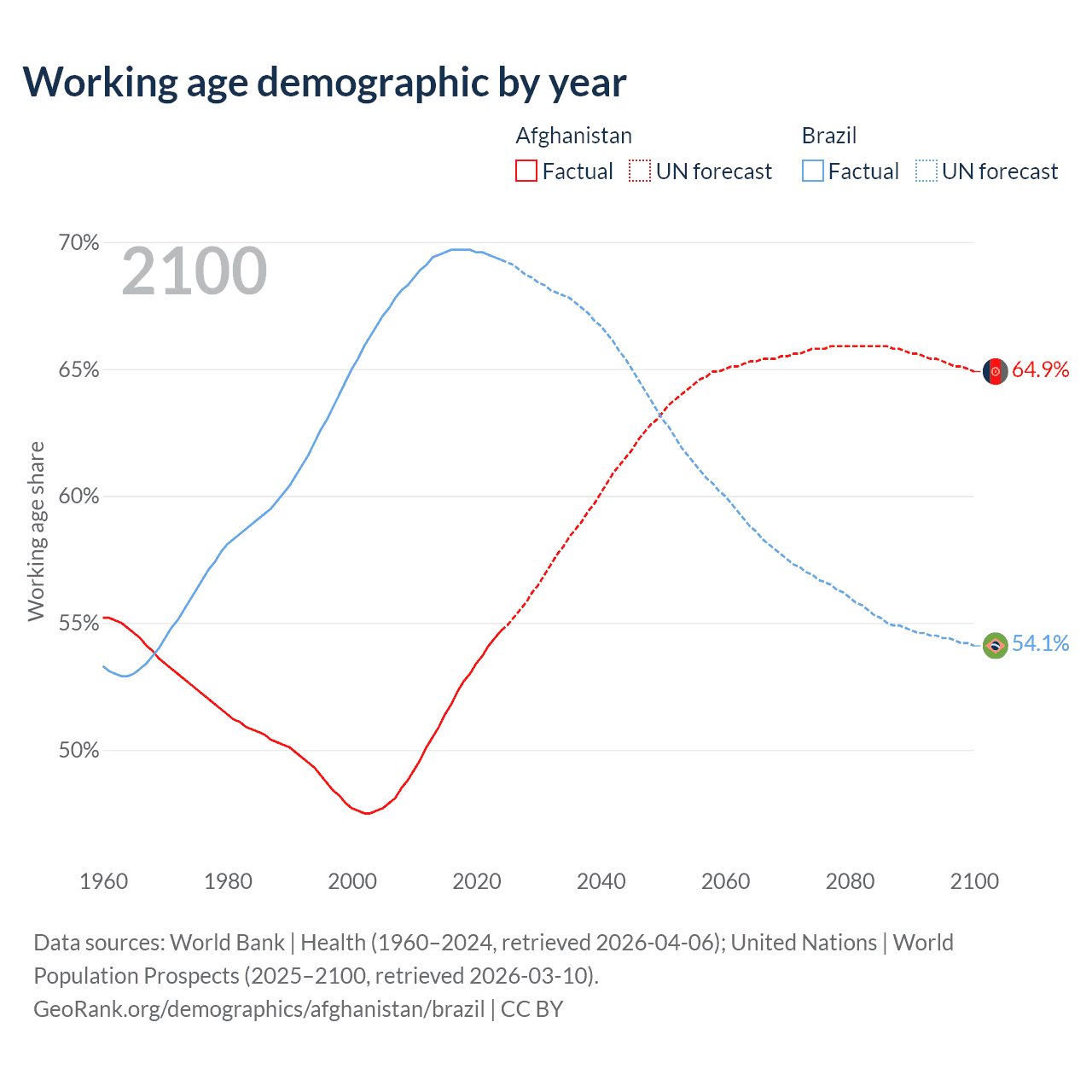 - Afghanistan has 24.8M working age adults (aged 15-64) vs 148M in Brazil.