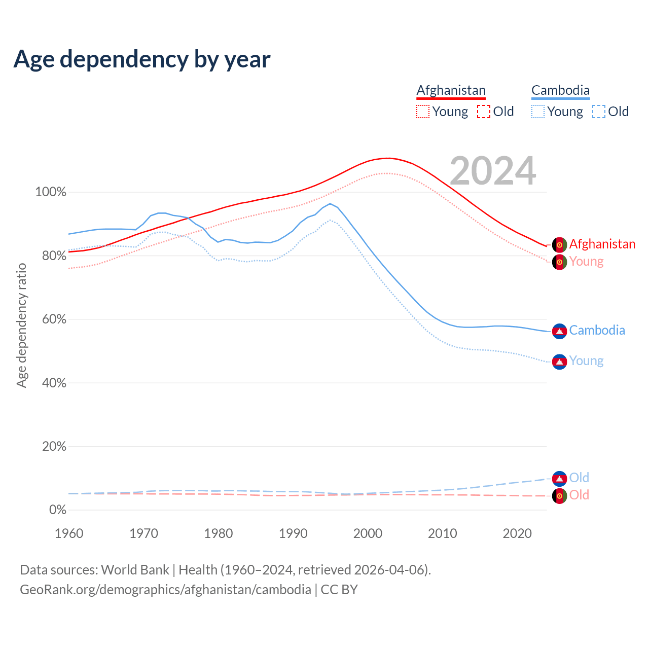 The share of older people aged 65 and over is 2.4% in Afghanistan and 6.16% in Cambodia. Life expectancy in Afghanistan compared to Cambodia .