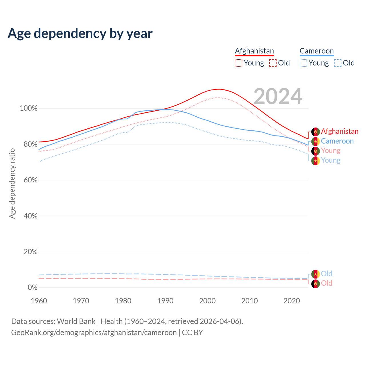 - The share of old-age demographic (65+) in Afghanistan is 2.4% vs 2.79% in Cameroon.