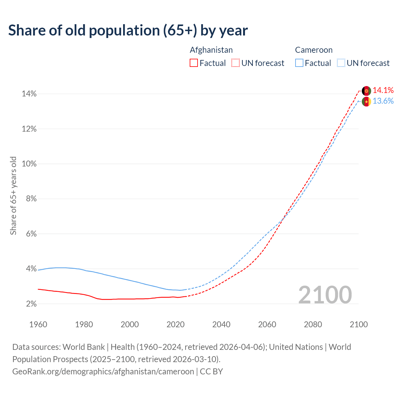 The share of older people aged 65 and over is 2.4% in Afghanistan and 2.79% in Cameroon. Life expectancy in Afghanistan compared to Cameroon .