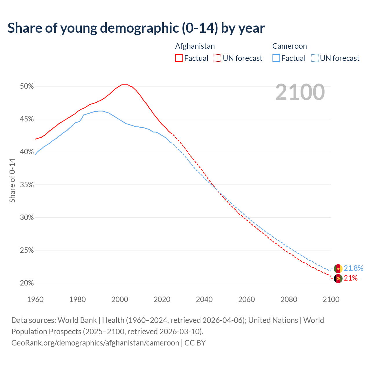- The share of young demographic (0-15 years old) in Afghanistan is 42.9% vs 41.4% in Cameroon.