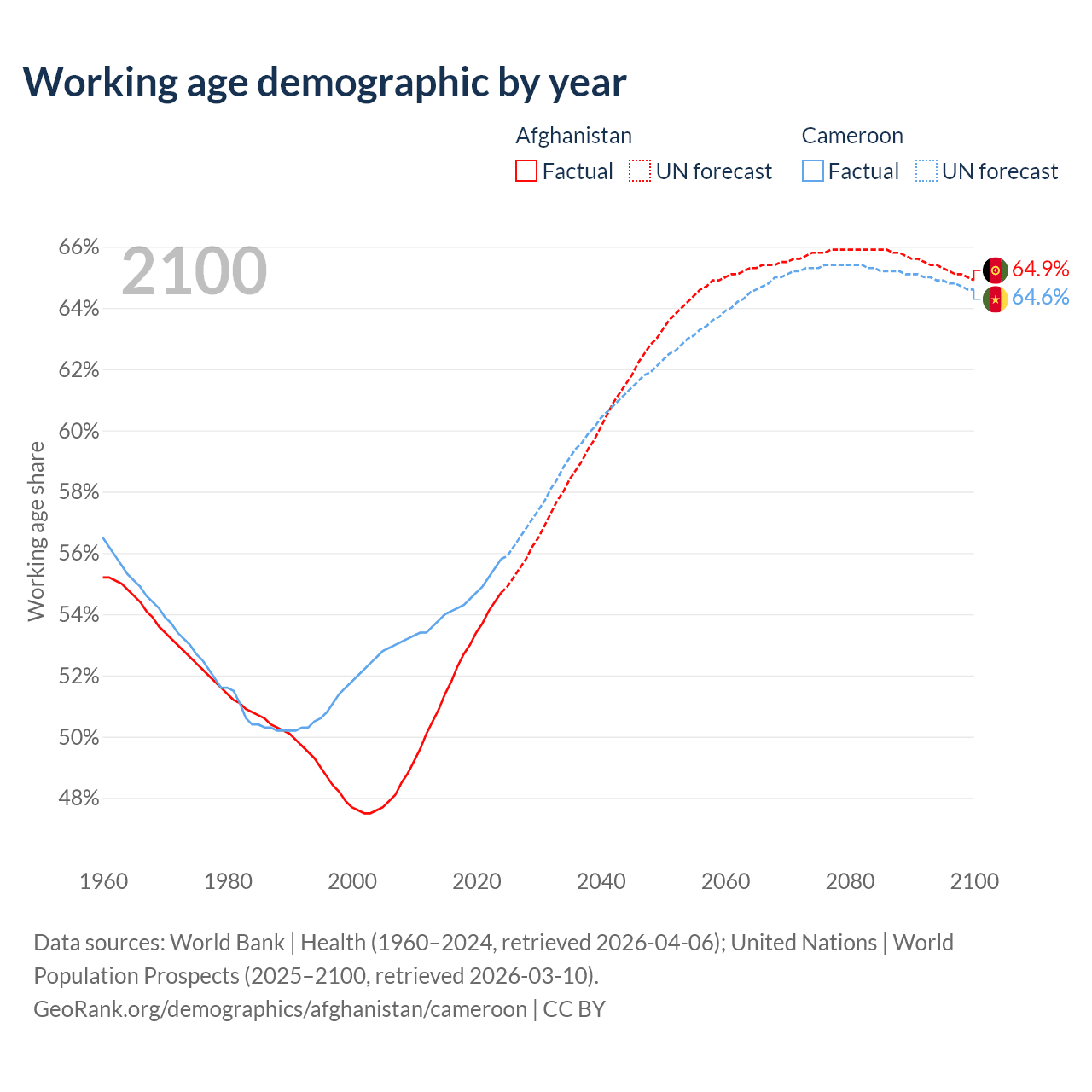 - Afghanistan has 24.8M working age adults (aged 15-64) vs 17.2M in Cameroon.