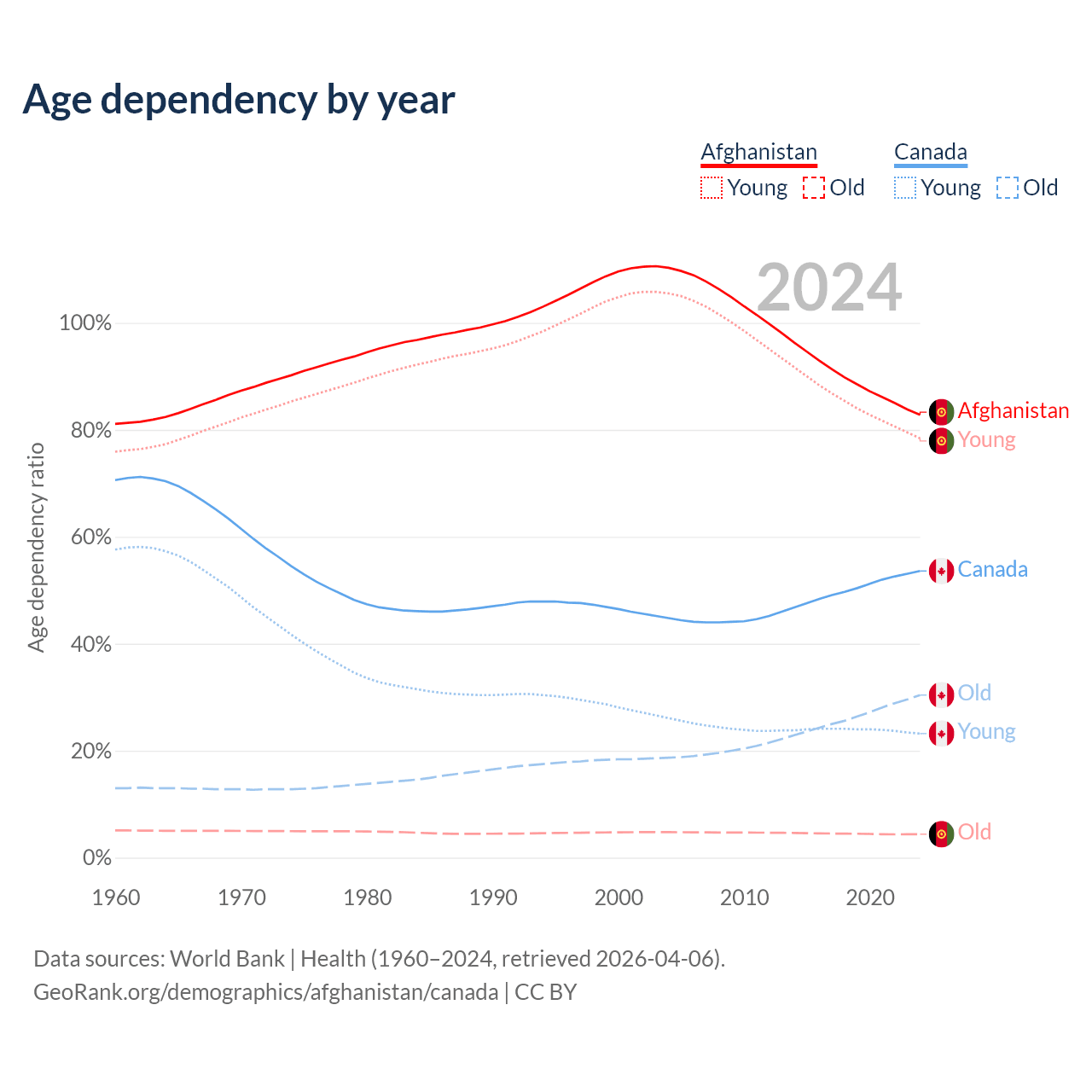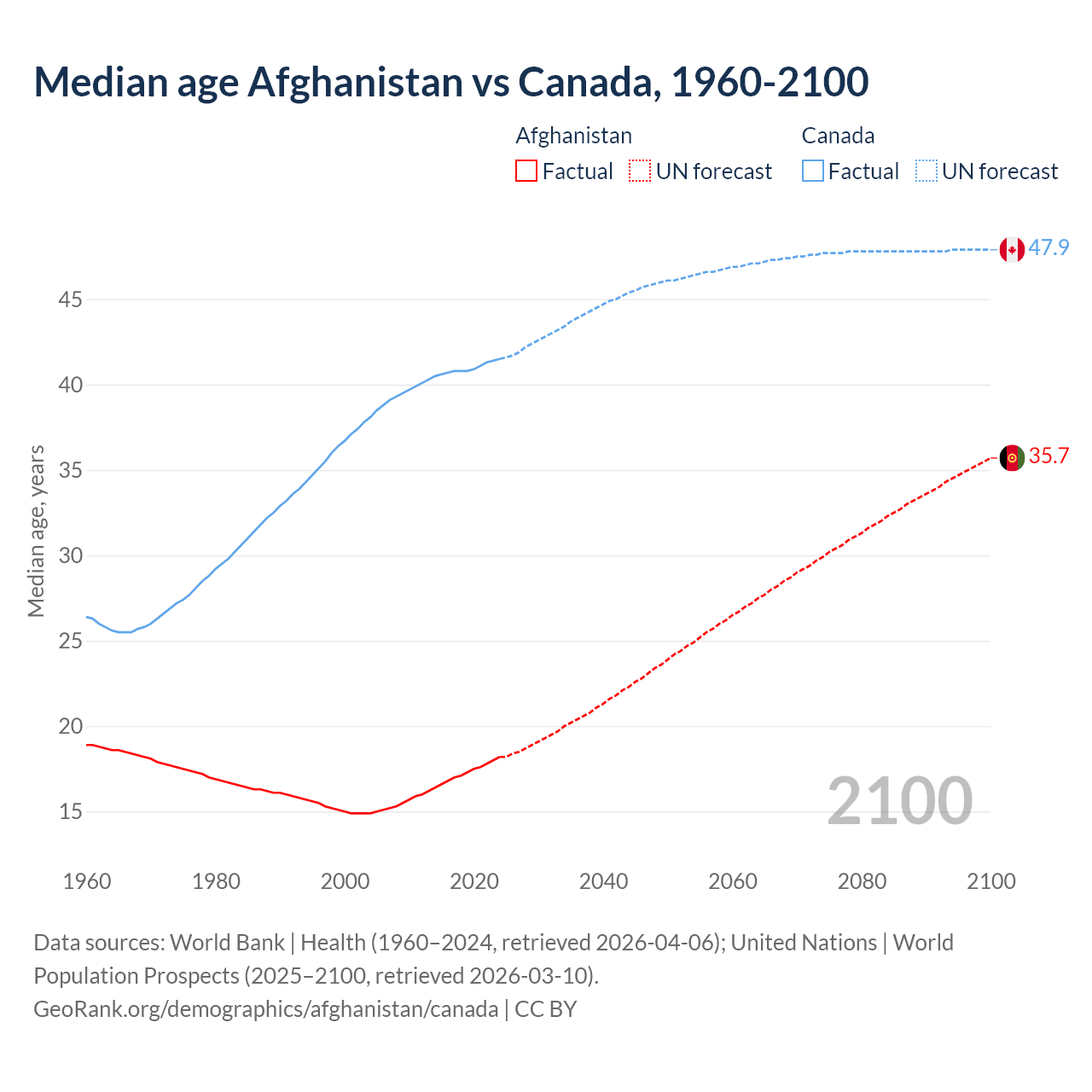 - Afghanistan is ranked 186/196 by median age (oldest to youngest) vs 38/196 for Canada.
