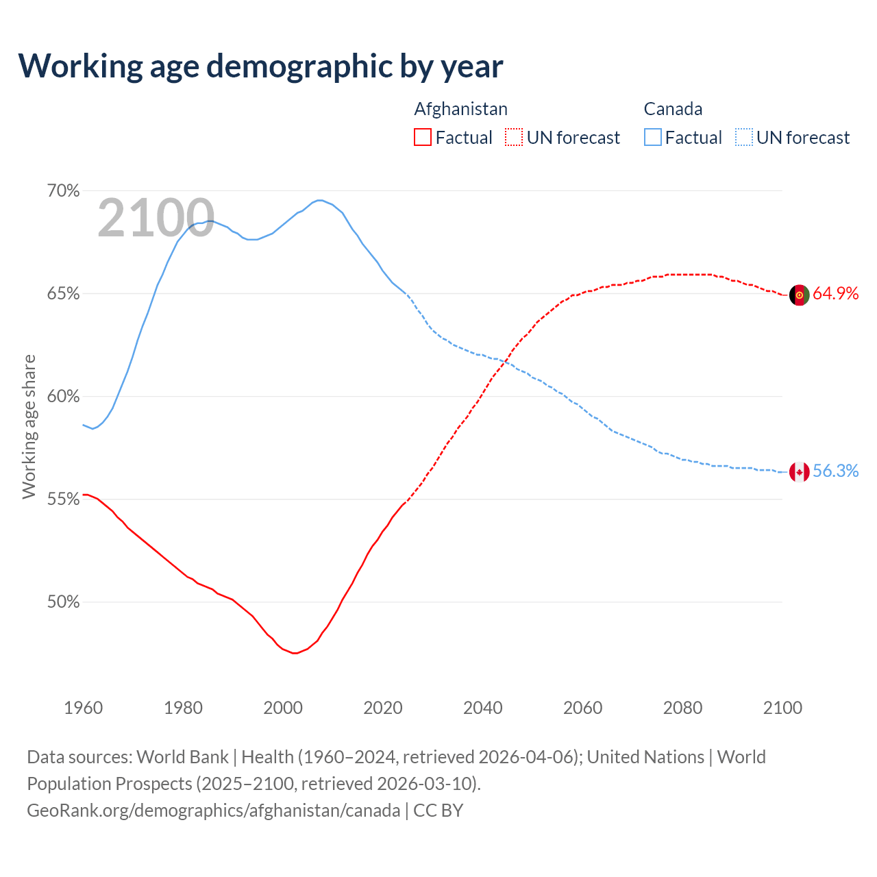 - Afghanistan has 24.8M working age adults (aged 15-64) vs 27.5M in Canada.