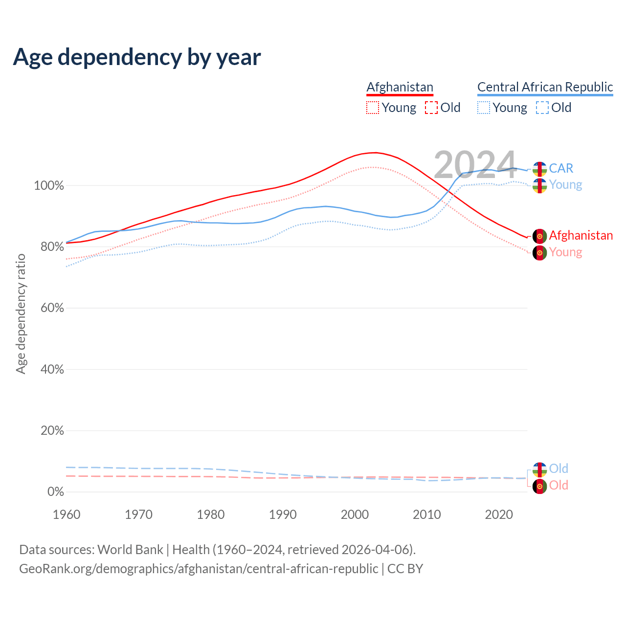 - The share of old-age demographic (65+) in Afghanistan is 2.4% vs 2.15% in the Central African Republic.