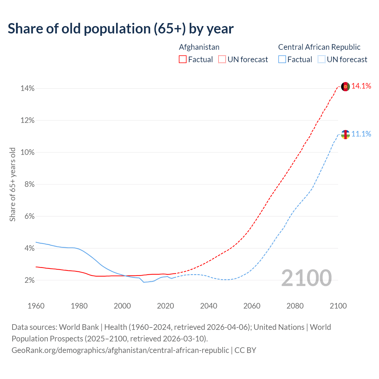 The share of older people aged 65 and over is 2.4% in Afghanistan and 2.15% in the Central African Republic. Life expectancy in Afghanistan compared to the Central African Republic .