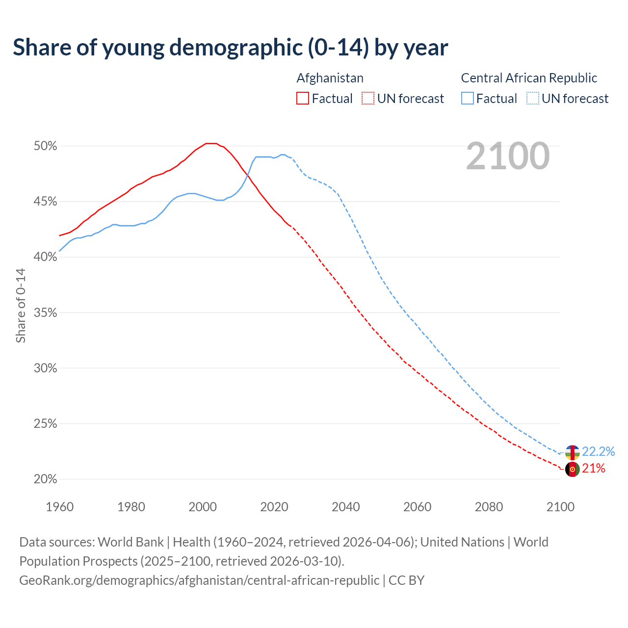 - The share of young demographic (0-15 years old) in Afghanistan is 42.9% vs 49% in the Central African Republic.