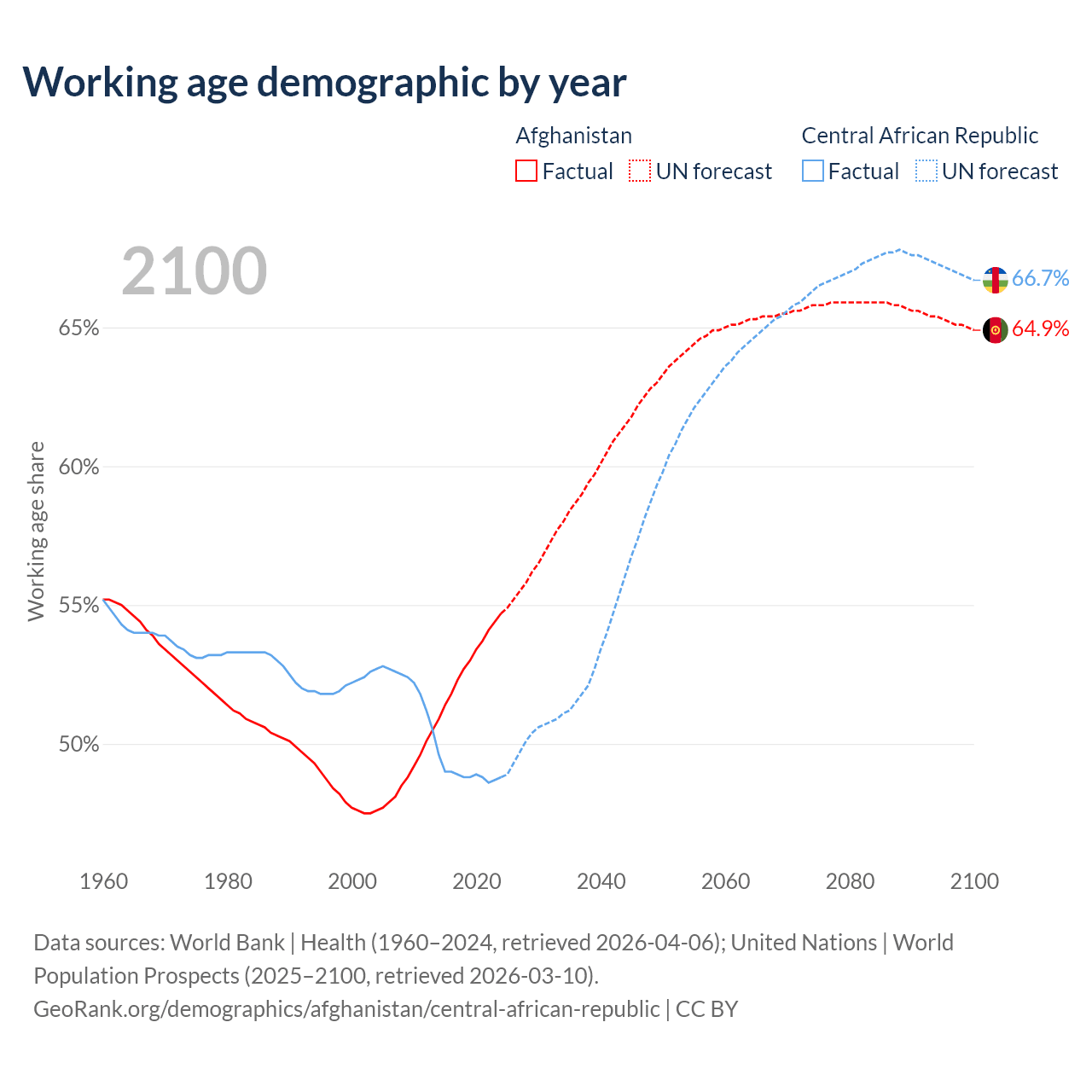 - Afghanistan has 24.8M working age adults (aged 15-64) vs 2.81M in the Central African Republic.