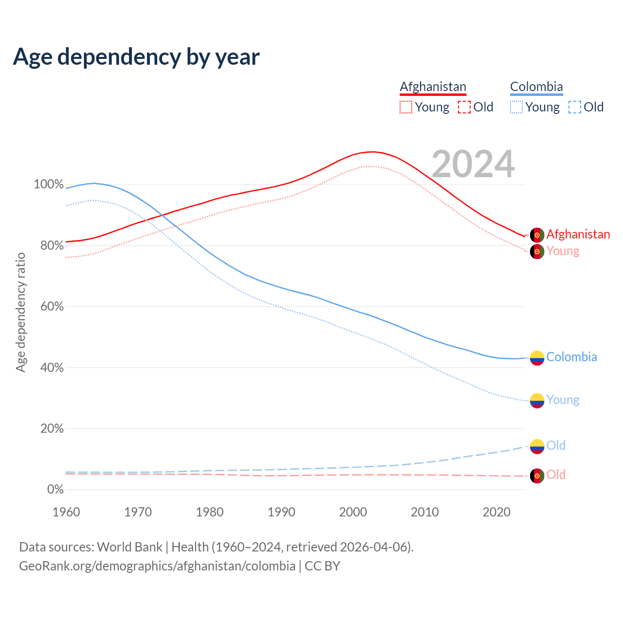 - The share of young demographic (0-15 years old) in Afghanistan is 42.9% vs 20.3% in Colombia.