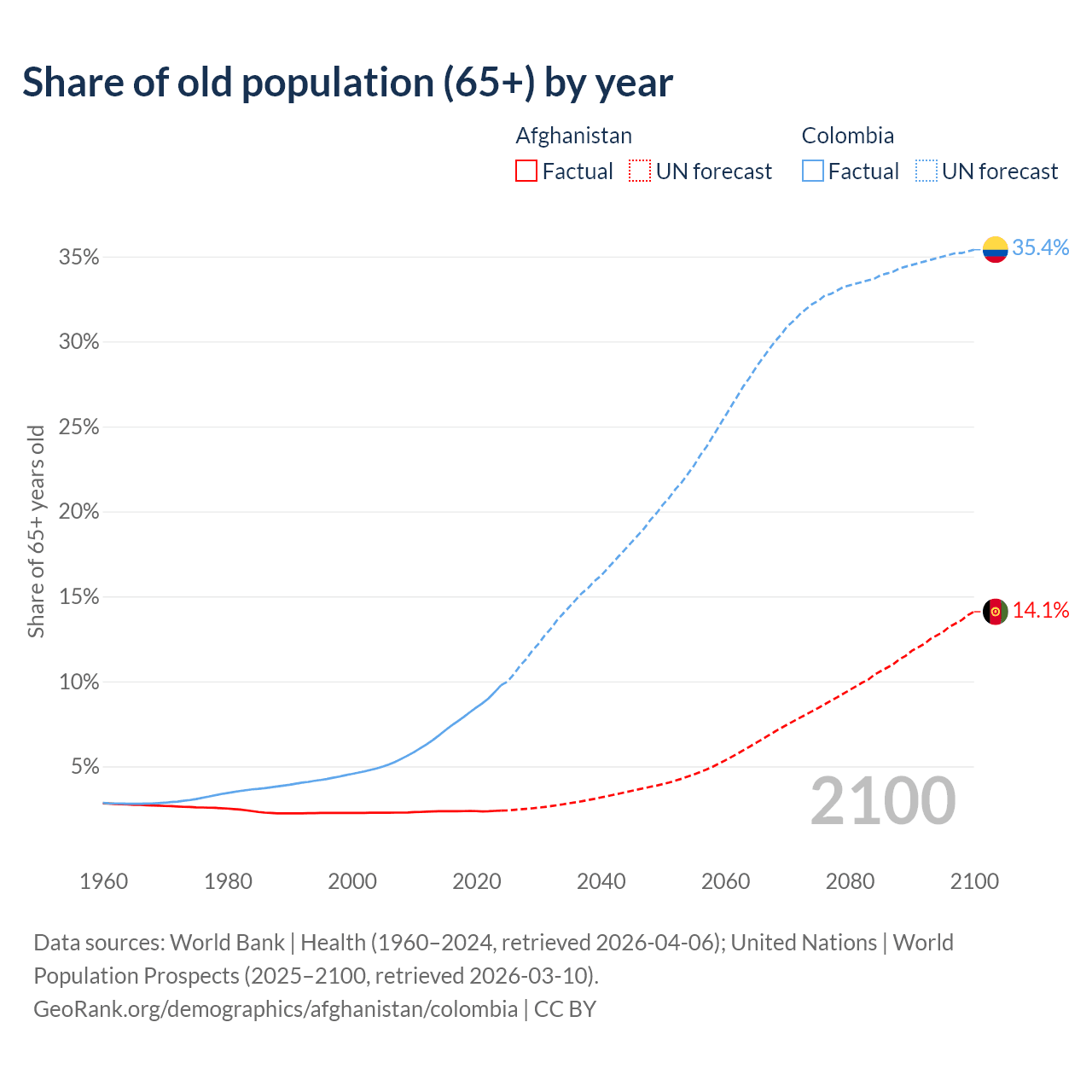 The share of older people aged 65 and over is 2.4% in Afghanistan and 9.78% in Colombia. Life expectancy in Afghanistan compared to Colombia .