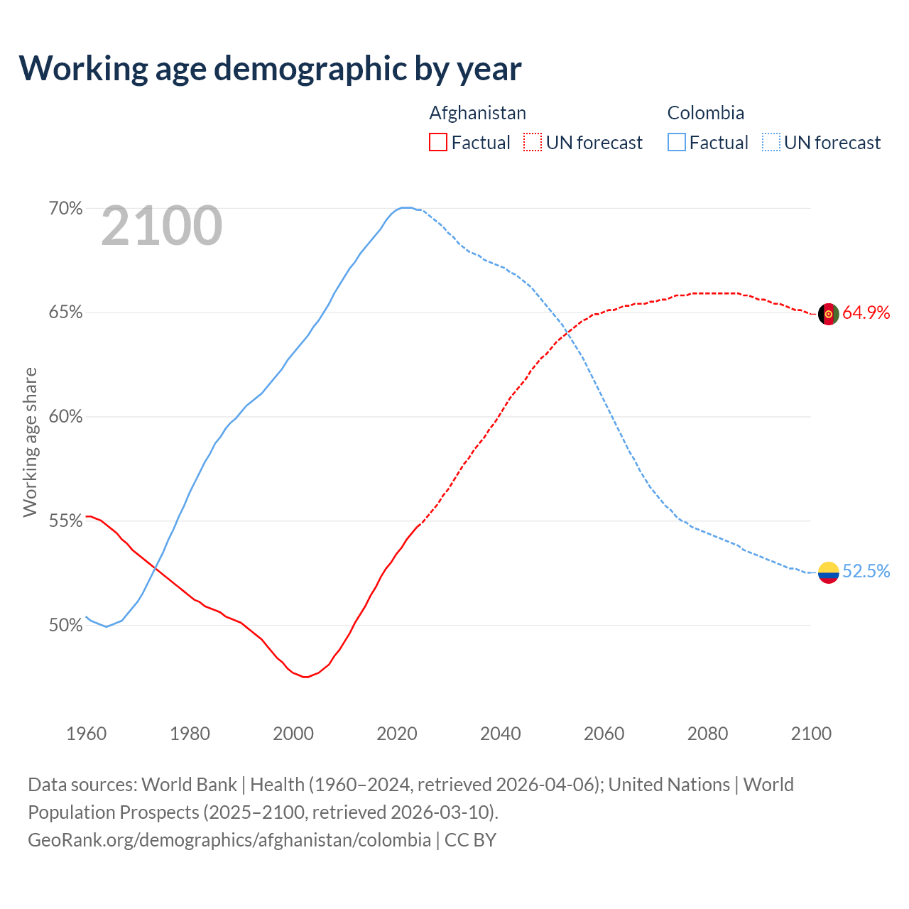 Median age Afghanistan vs Colombia, 1960-2100