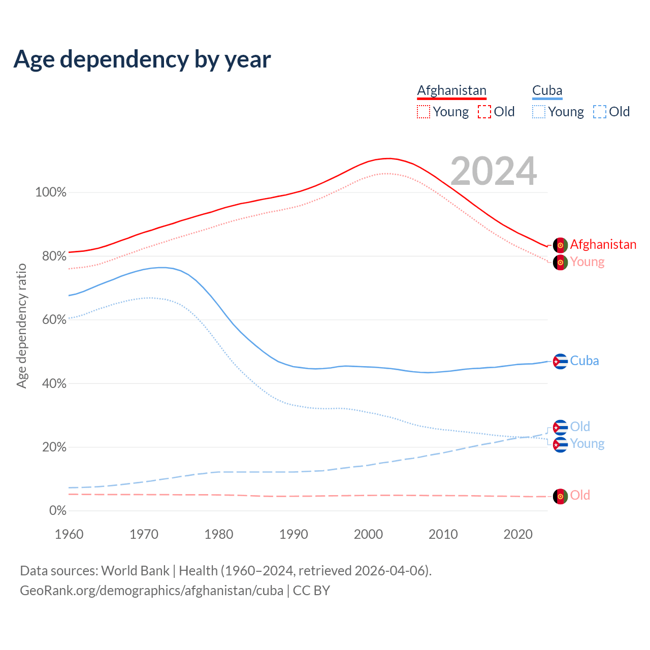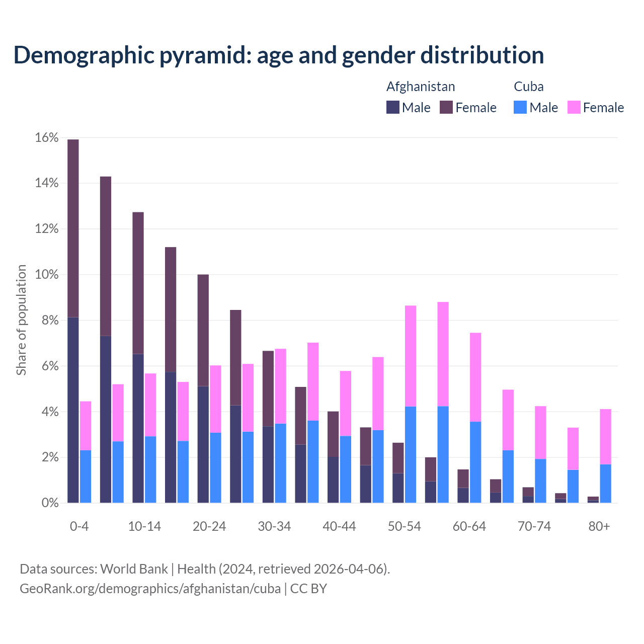 - The share of old-age demographic (65+) in Afghanistan is 2.4% vs 16.6% in Cuba.