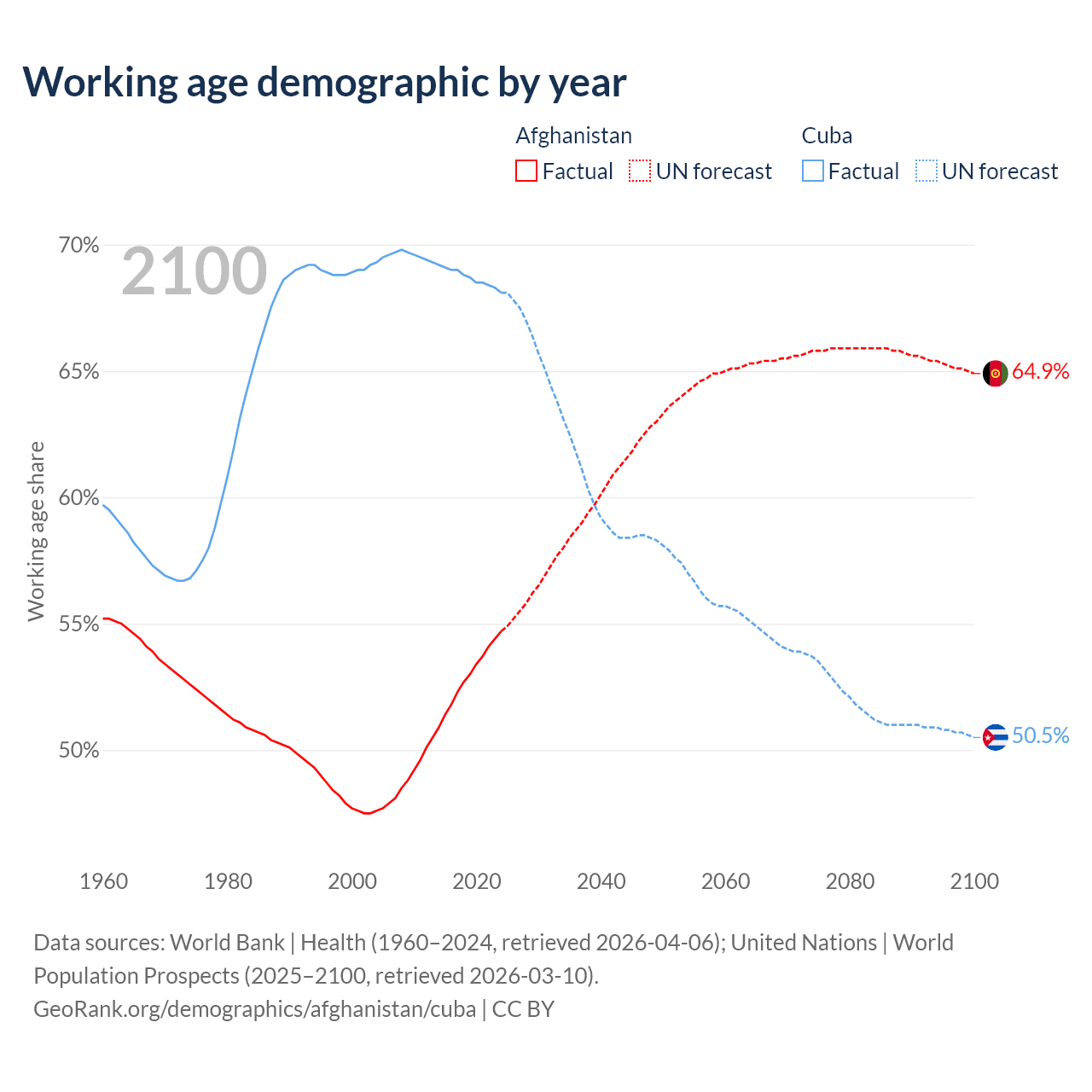 The share of older people aged 65 and over is 2.4% in Afghanistan and 16.6% in Cuba. Life expectancy in Afghanistan compared to Cuba .