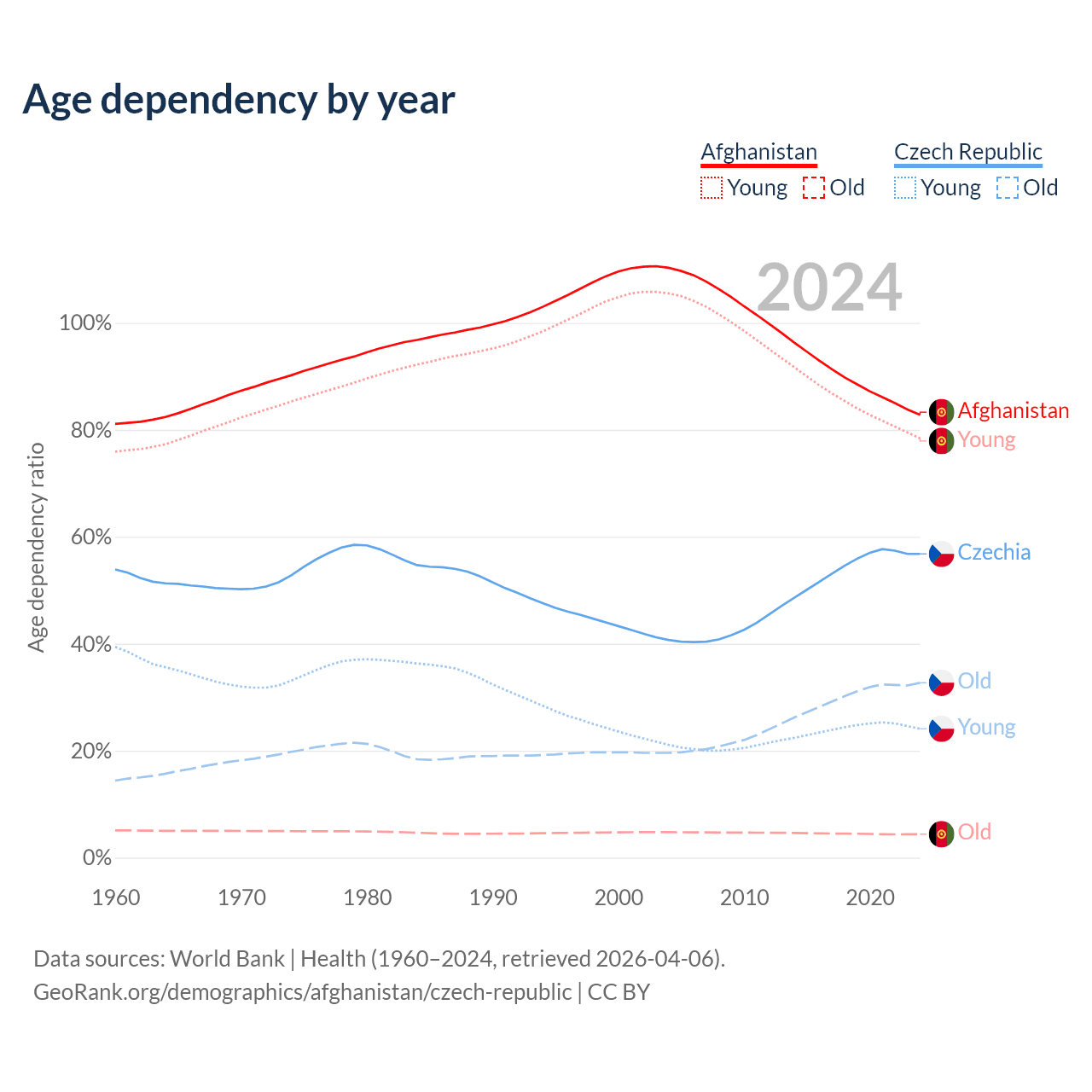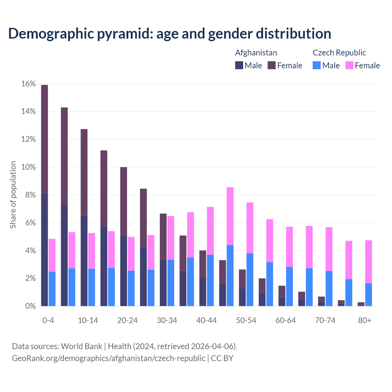- Afghanistan is ranked 186/196 by median age (oldest to youngest) vs 21/196 for the Czech Republic.