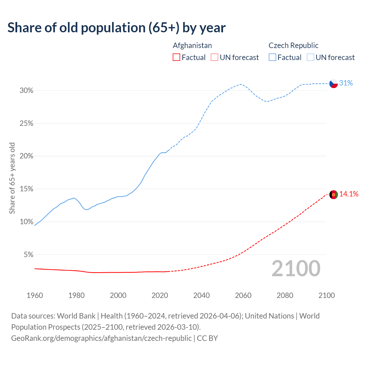 - The share of old-age demographic (65+) in Afghanistan is 2.4% vs 20.8% in the Czech Republic.