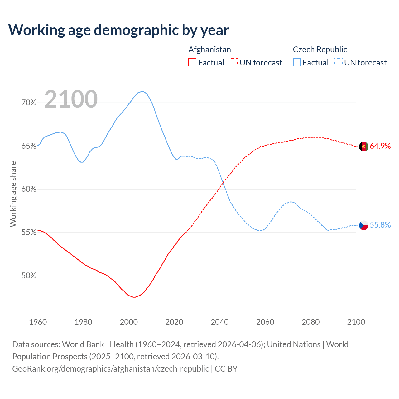 - Afghanistan has 24.8M working age adults (aged 15-64) vs 6.79M in the Czech Republic.