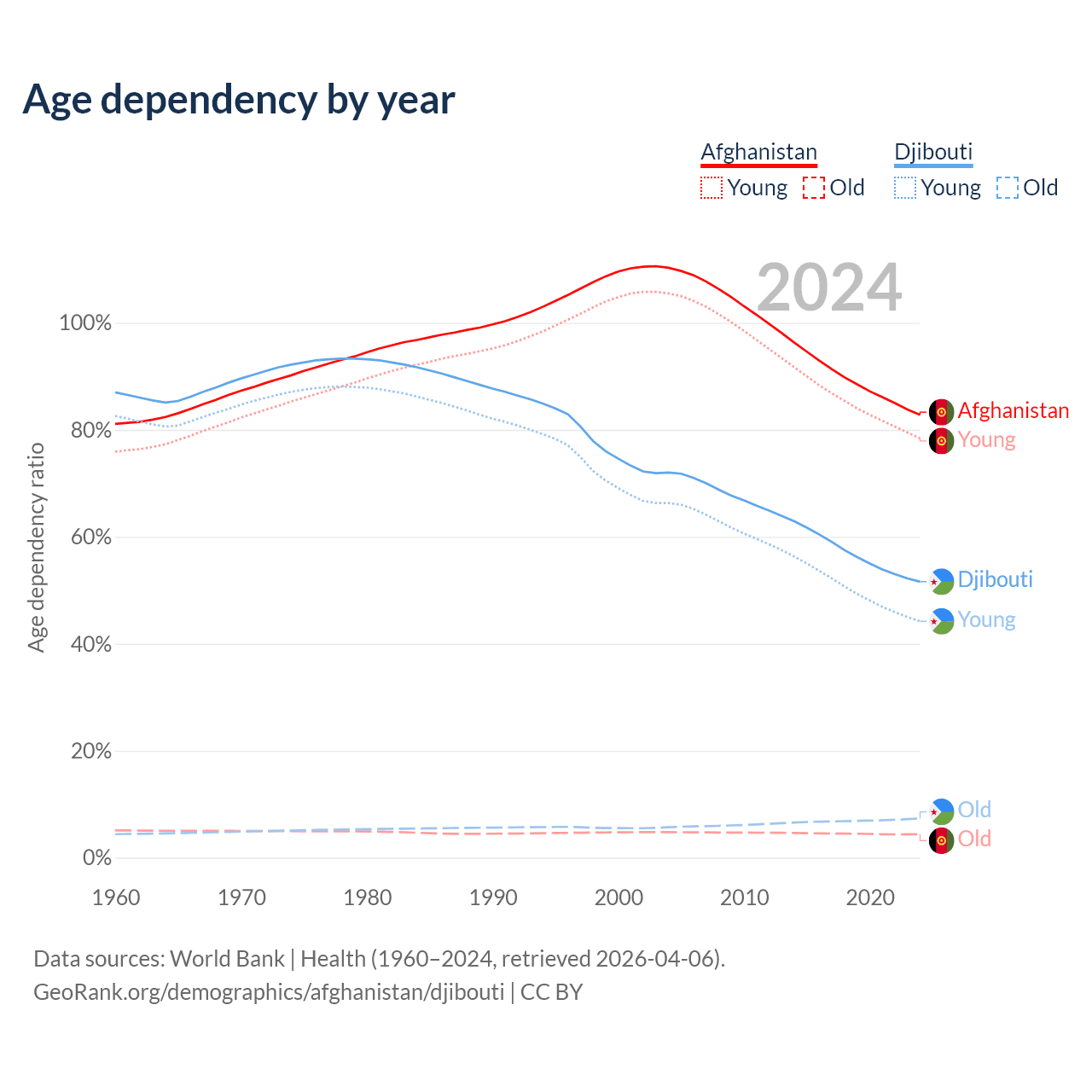 - Afghanistan is ranked 186/196 by median age (oldest to youngest) vs 129/196 for Djibouti.