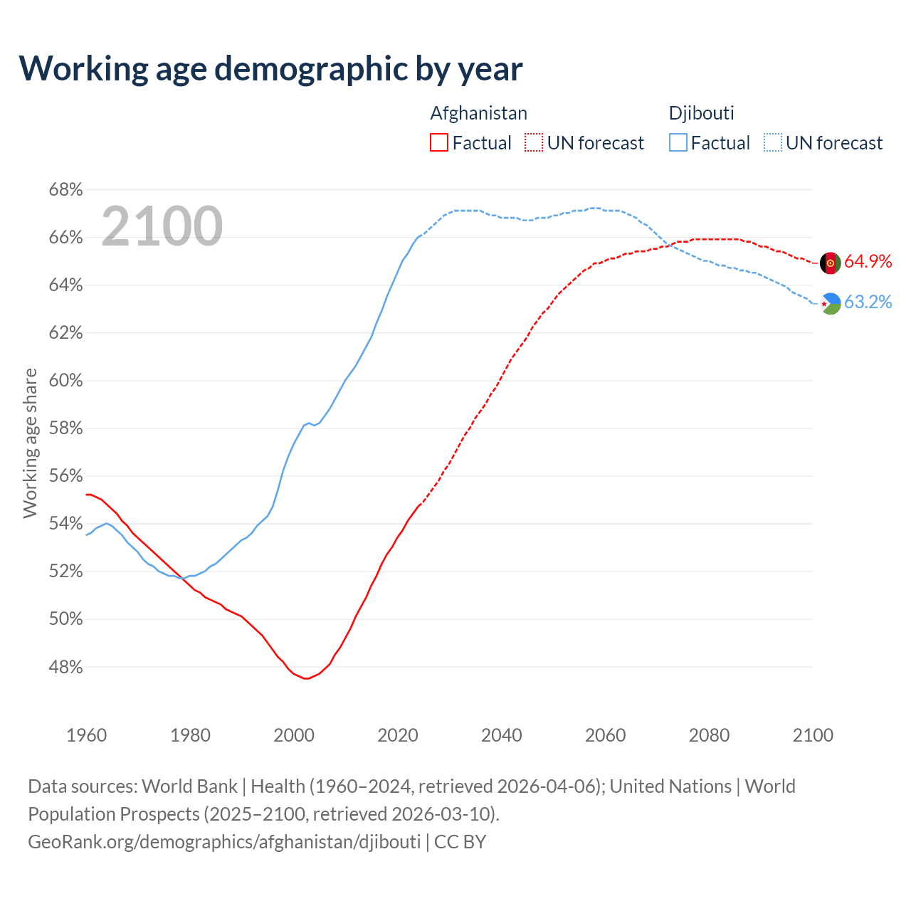 - Afghanistan has 24.8M working age adults (aged 15-64) vs 794K in Djibouti.