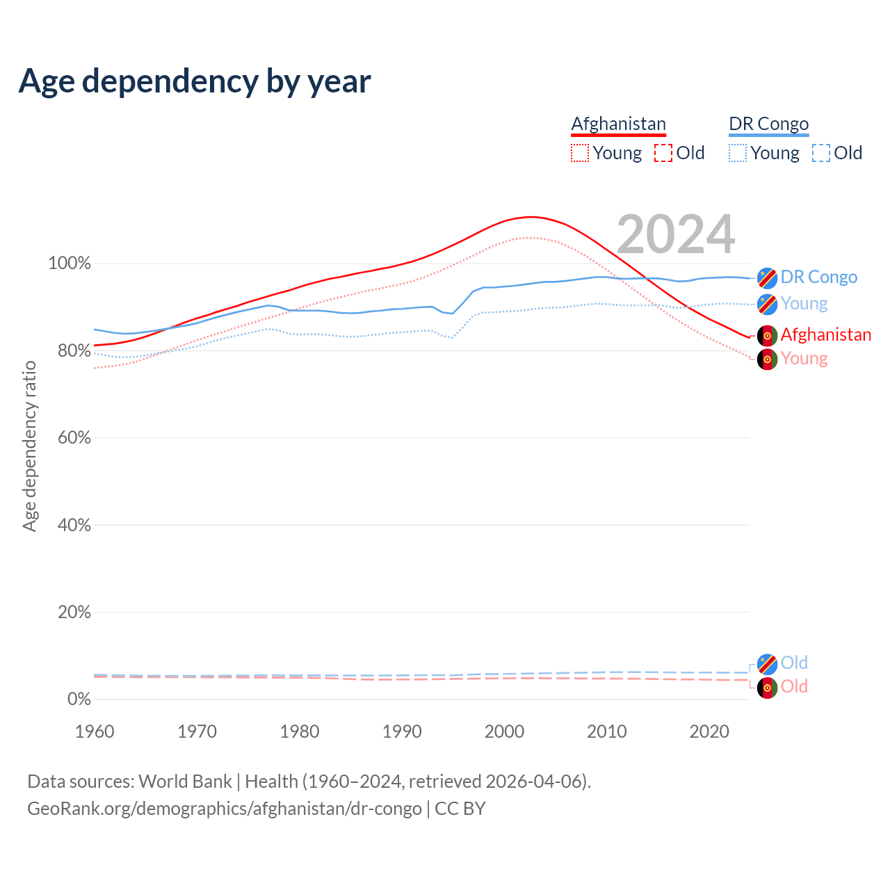 - Afghanistan is ranked 186/196 by median age (oldest to youngest) vs 191/196 for the DR Congo.