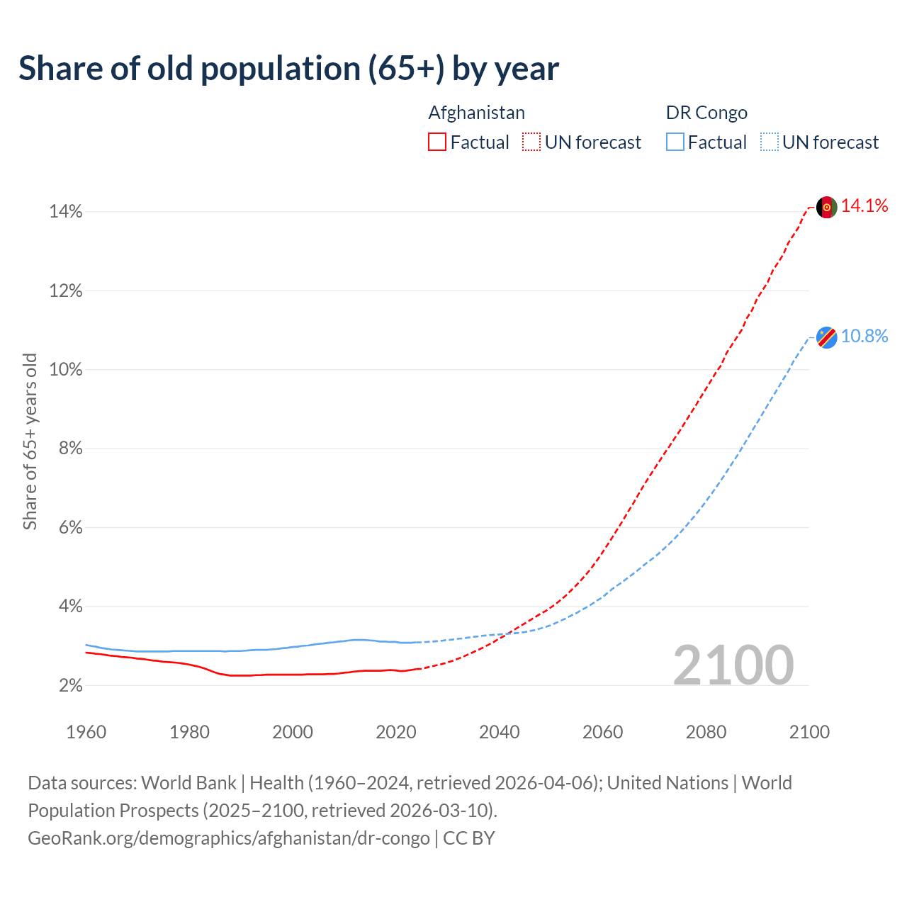 - The share of old-age demographic (65+) in Afghanistan is 2.4% vs 3.08% in the DR Congo.