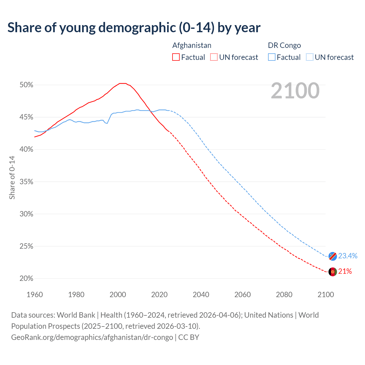- The share of young demographic (0-15 years old) in Afghanistan is 42.9% vs 46% in the DR Congo.
