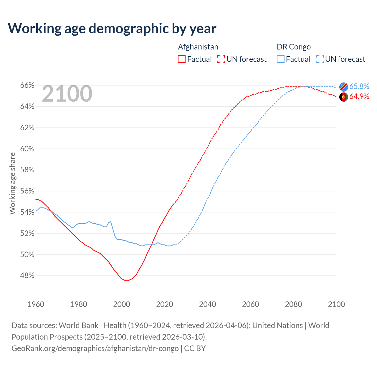 - Afghanistan has 24.8M working age adults (aged 15-64) vs 59.8M in the DR Congo.