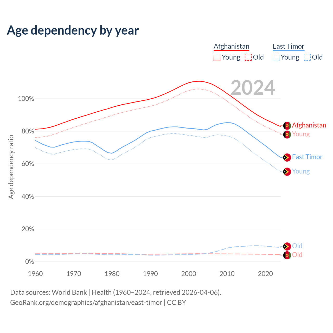 - Afghanistan is ranked 186/196 by median age (oldest to youngest) vs 145/196 for East Timor.