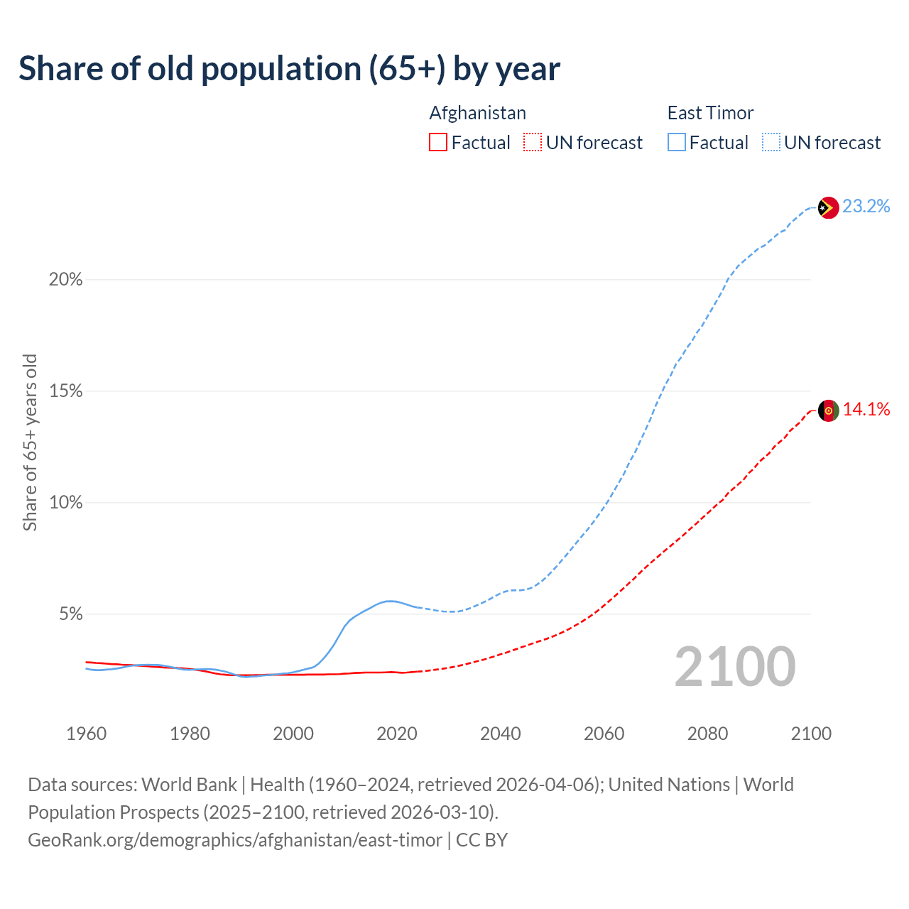 - The share of old-age demographic (65+) in Afghanistan is 2.4% vs 5.28% in East Timor.