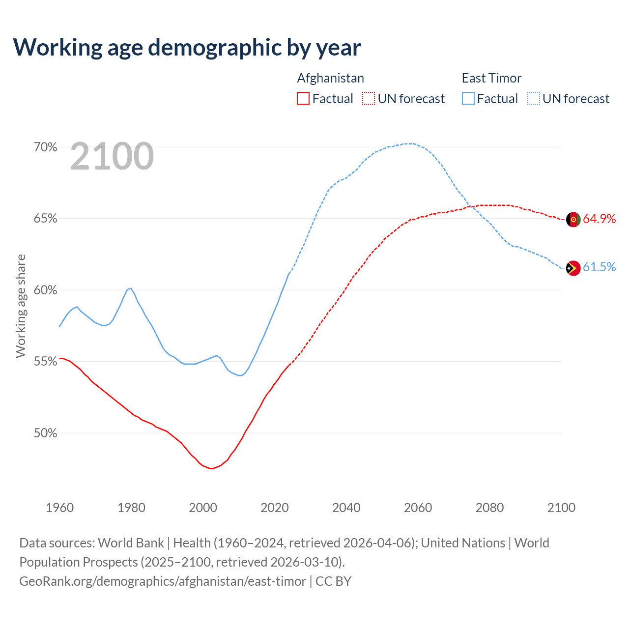 - Afghanistan has 24.8M working age adults (aged 15-64) vs 880K in East Timor.