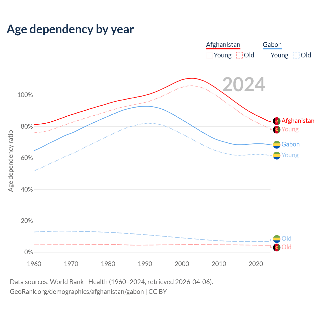 - The share of old-age demographic (65+) in Afghanistan is 2.4% vs 4.08% in Gabon.