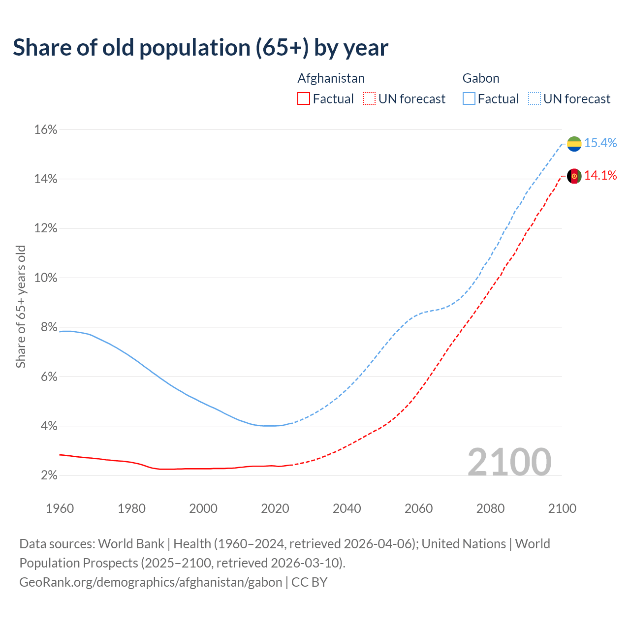 The share of older people aged 65 and over is 2.4% in Afghanistan and 4.08% in Gabon. Life expectancy in Afghanistan compared to Gabon .