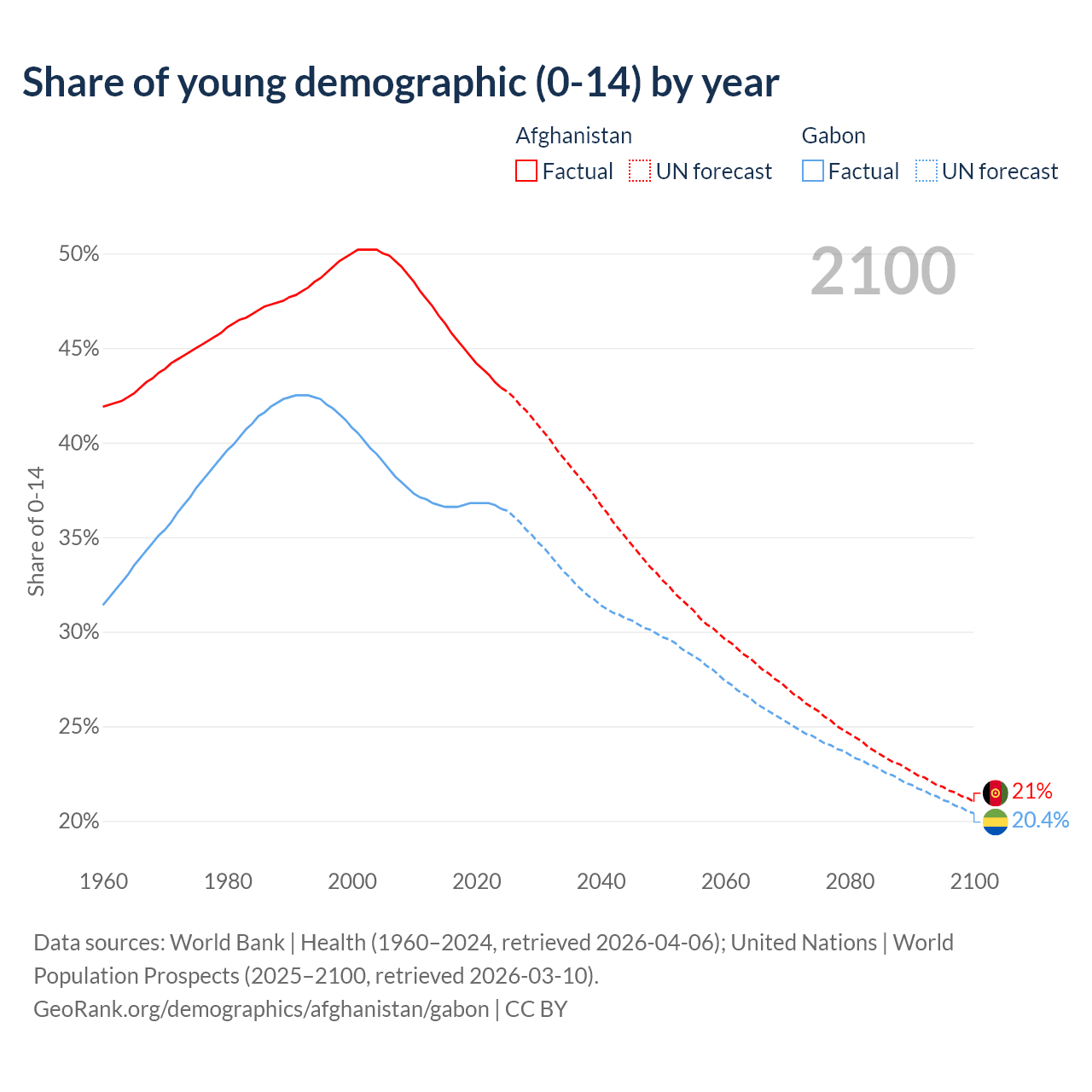 - The share of young demographic (0-15 years old) in Afghanistan is 42.9% vs 36.5% in Gabon.
