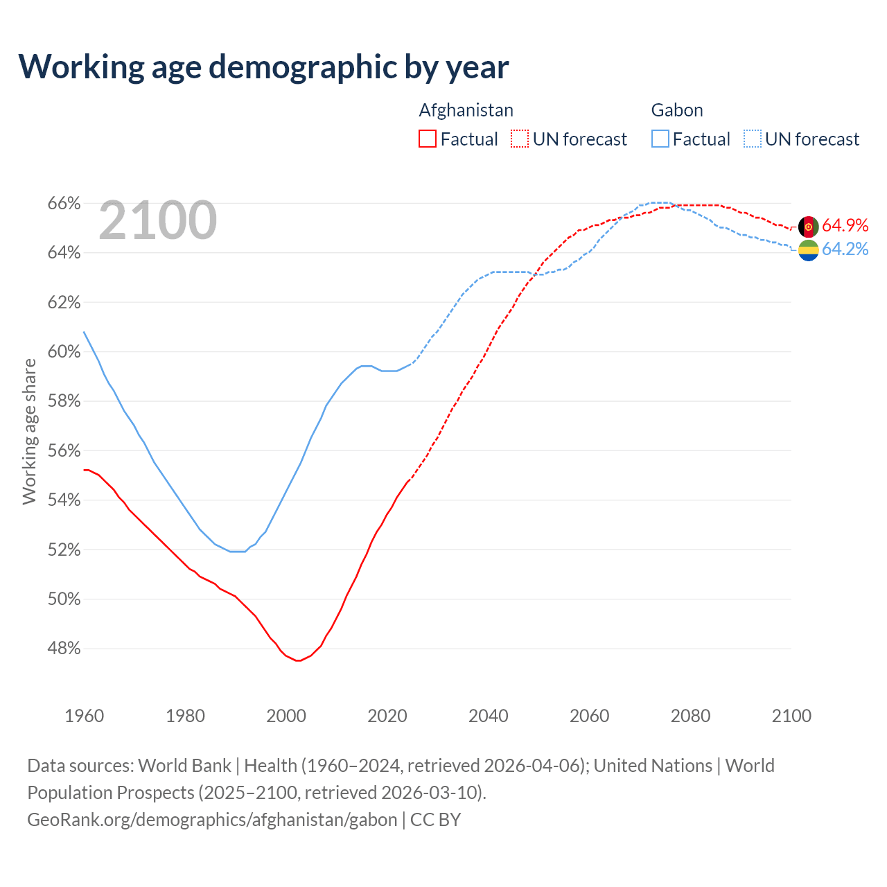 Median age Afghanistan vs Gabon, 1960-2100